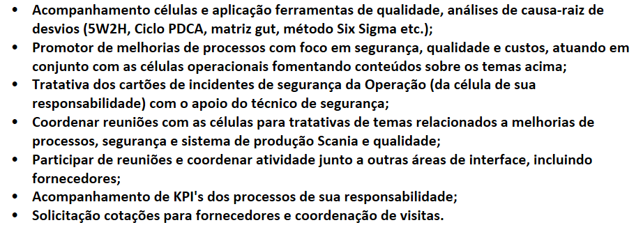 - Uso de ferramentas: aplicar metodologias e ferramentas de análise de causa raiz para eliminar desvios e consolidar práticas de melhoria contínua.